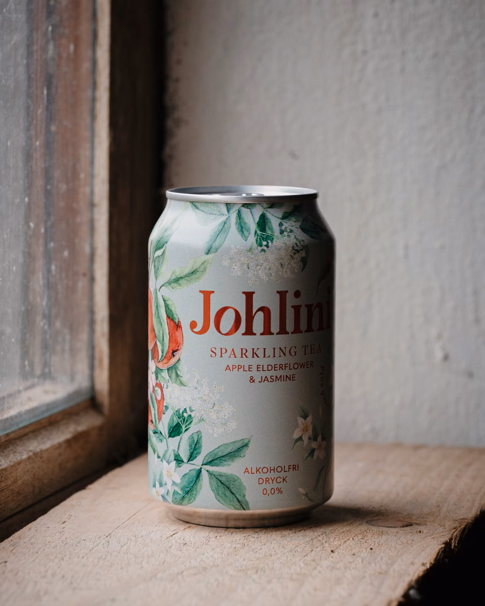 Johlini Sparkling tea 33cl, med smak av äpple, fläder och Jasmin. En alldeles ljuvlig alkoholfri, bubblig och törstsläckande dryck.